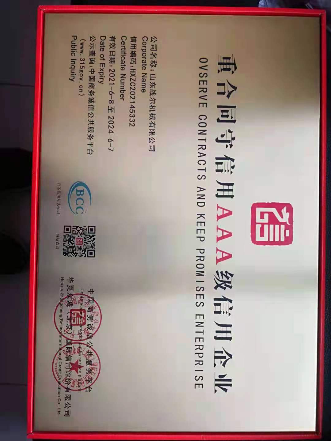 • 重合同守信用AAA级信用企业